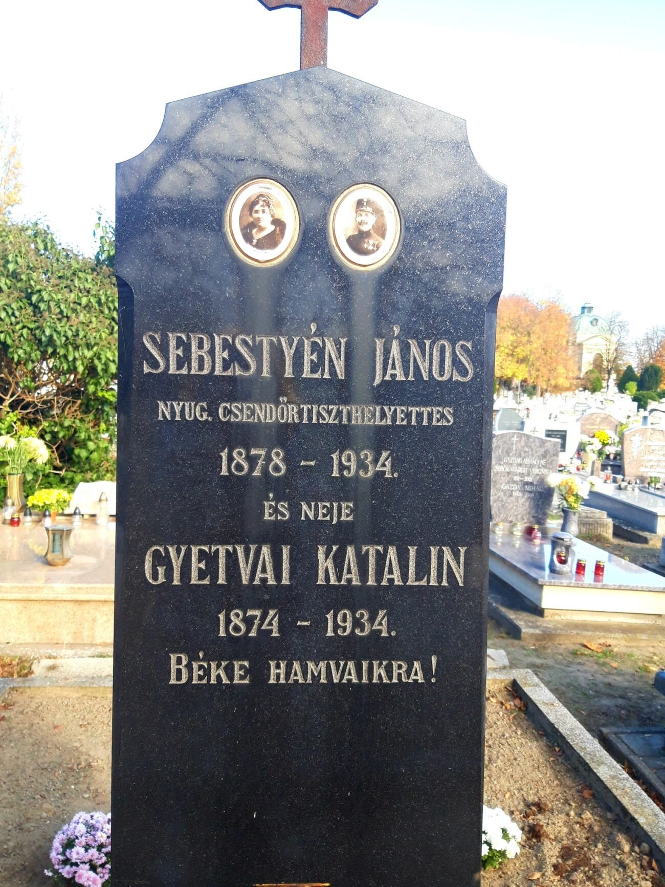 A minap egy temetöben jártam, és erre a siremlékre lettem figyelmes . Itt nyugszik egycsendór tiszthelyettes,és hitvese.